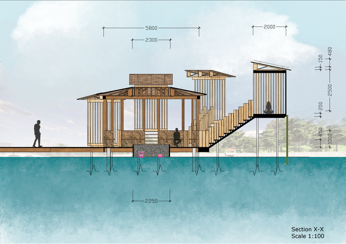 The pavilion layout is performed in heptagonal shape, consisted of 7 platforms and sorted at both sides from low to high level, where the mindfulness meditation take place. The middle of the pavilion is a main terrace, connect with a 30 meters long pedestrian bridge from the river bank, also it has hole at the centre which acts as a pond directly into the lake, The surface of the water is also covered with lotus.